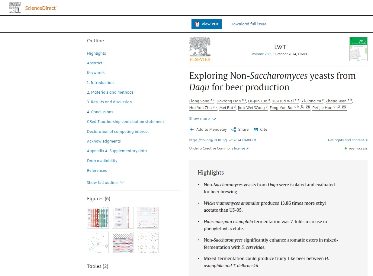 近日,中國科學(xué)院微生物研究所在國際期刊LWT-Food Science and Technology(《LWT-食品科技》)上發(fā)表了一篇論文——《Exploring Non-Saccharomyces yeasts from Daqu for beer production》(《探索來自大曲的非酵母酵母用于啤酒生產(chǎn)》)。