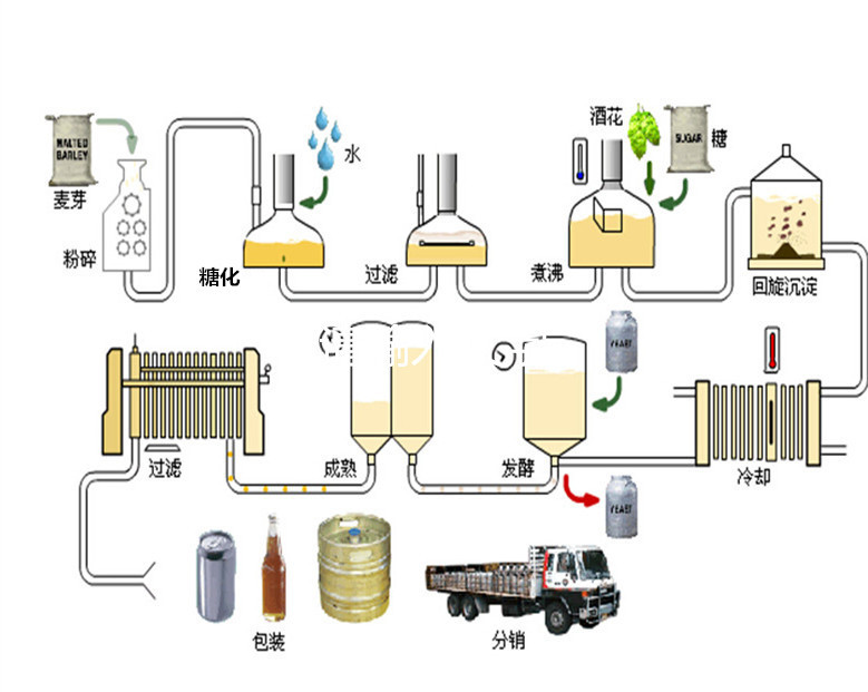 啤酒生產(chǎn)工藝流程可以分為制麥、糖化、發(fā)酵、包裝四個(gè)工序。現(xiàn)代化的啤酒廠一般已經(jīng)不再設(shè)立麥芽車間,因此制麥部分也將逐步從啤酒生產(chǎn)工藝流程中剝離。