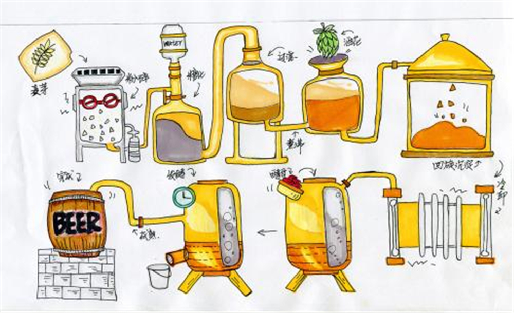 麥芽在送入釀造車間之前,先被送到粉碎塔在這里,麥芽經(jīng)過輕壓粉碎制成釀造用麥芽糊化處理即將粉碎的麥芽/谷粒與水在糊化鍋中混合。糊化鍋是一個(gè)巨大的回旋金屬容器,裝有熱水與蒸汽入口,攪拌裝置如攪拌棒、攪拌槳或螺旋槳,以及大量的溫度與控制裝置。在糊化鍋中,麥芽和水經(jīng)加熱后沸騰,這是天然酸將難溶性的淀粉和蛋白質(zhì)轉(zhuǎn)變成為可溶性的麥芽提取物,稱作麥芽汁。然后麥芽汁被送至稱作分離塔的濾過容器。麥芽汁在被泵入煮沸鍋之前需先在過濾槽中去除其中的麥芽皮殼,并加入酒花和糖。煮沸:在煮沸鍋中,混合物被煮沸以吸取酒花的味道,并起色和消毒。在煮沸后加入酒花的麥芽汁被泵入回旋沉淀槽以去處不需要的酒花剩余物和不溶性的蛋白質(zhì)。